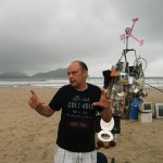Mario Alvim, qui se qualifie d’artiste-citoyen-bricoleur-militant, a fait la jonction entre le temps de séminaire à Juiz de Fora et la semaine à Ubatuba. Mario est sculpteur, il a récupéré des déchets à droite à gauche pour en faire une tour autonome, mise en scène sur la plage, lieu du crime du flux et reflux de la mer et de ses déchets …