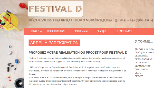 Vous avez l'âme d'un bidouilleur et vous aimez faire découvrir vos idées ? Le bricolage numérique n'a plus de secrets pour vous ? Alors venez présenter votre projet/réalisation à Festival D.